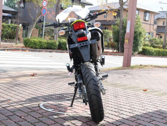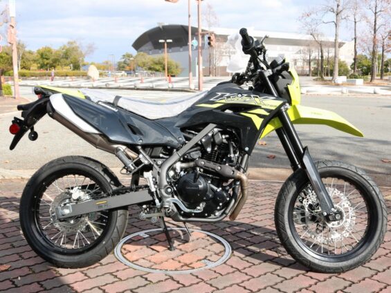 KLX230をベースに前後17インチホイール、大径ブレーキディスク、フロント倒立フォーク等を採用してモタード仕様になったのがこのKLX230SMです。オフロードベースの車体ならではの軽量な車重、独特の軽快なハンドリングは一度体感するとクセになります。